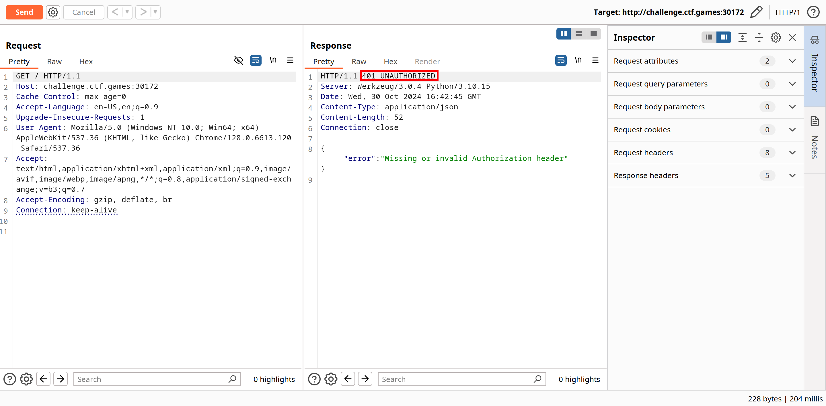 To investigate, let’s intercept the traffic using BurpSuite. This confirms that our access returns a 401 UNAUTHORIZED