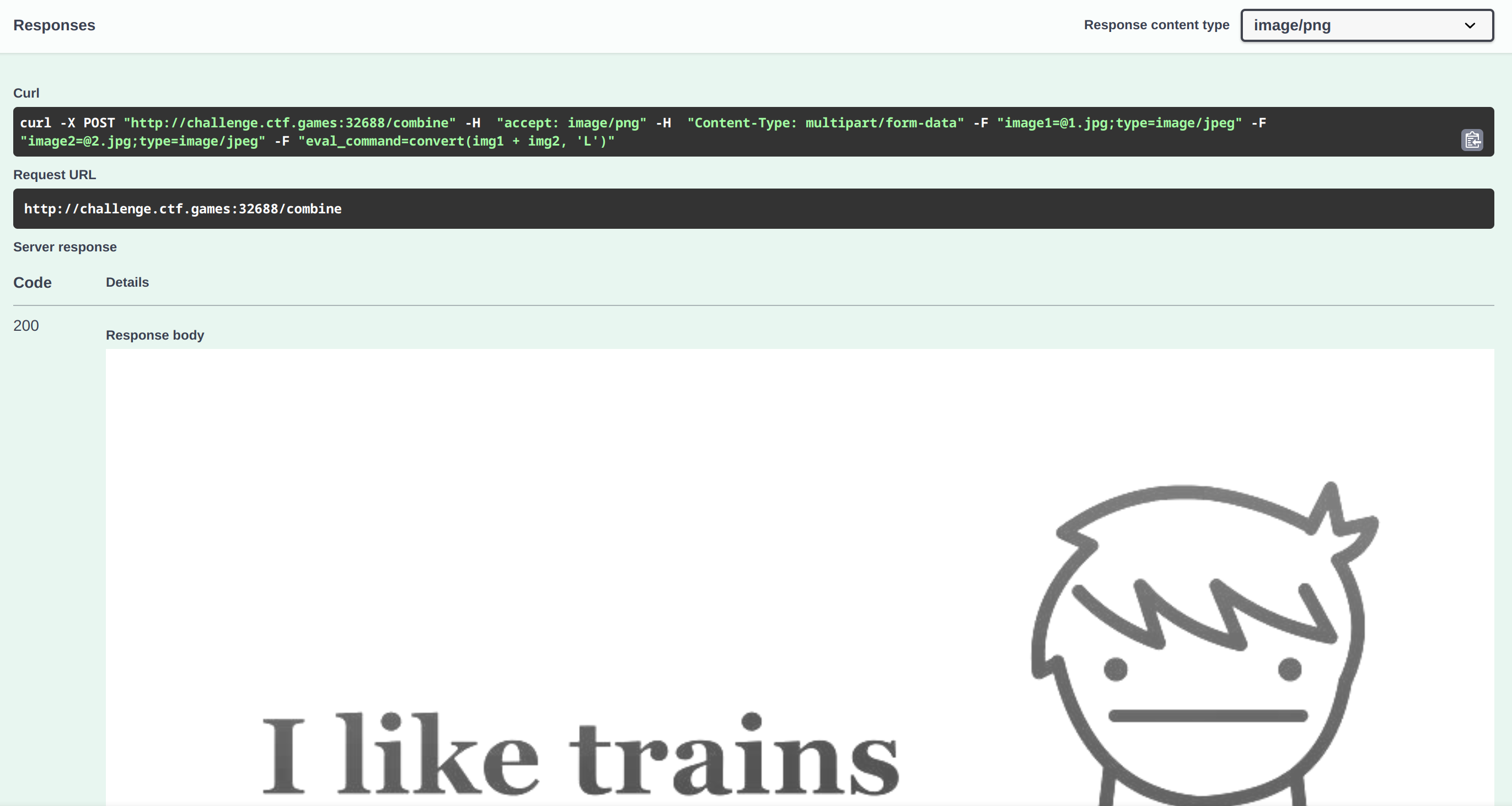 Upon accessing the website, we find a form that allows uploading two images and combining them. There’s also a hint about API documentation available at /swagger